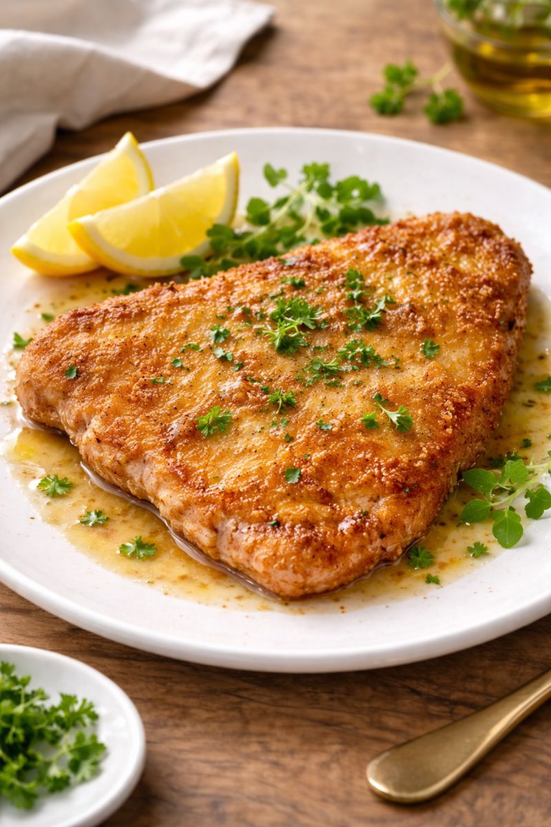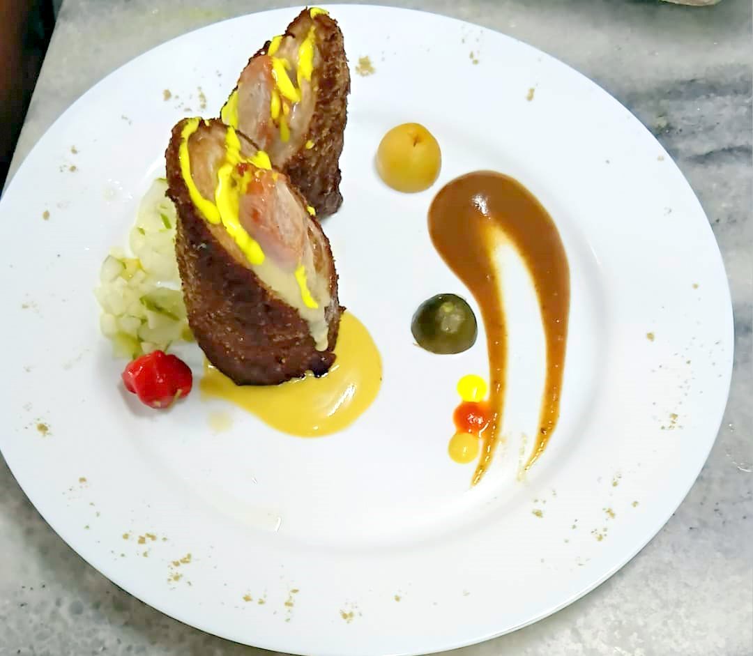 Delicadamente empanizado y dorado hasta lograr una textura crujiente y elegante. La carne de cerdo se cocina con precisión para conservar su jugosidad natural, ofreciendo un bocado suave, aromático y lleno de matices que elevan este clásico a una experiencia más sofisticada.