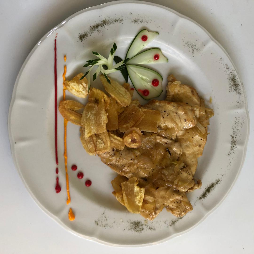 Jugoso, dorado y lleno de sabor. Láminas de cerdo tiernas se cocinan lentamente con abundante cebolla caramelizada y un toque de sazón criolla, creando un plato aromático, reconfortante y perfecto para acompañar con arroz y viandas.